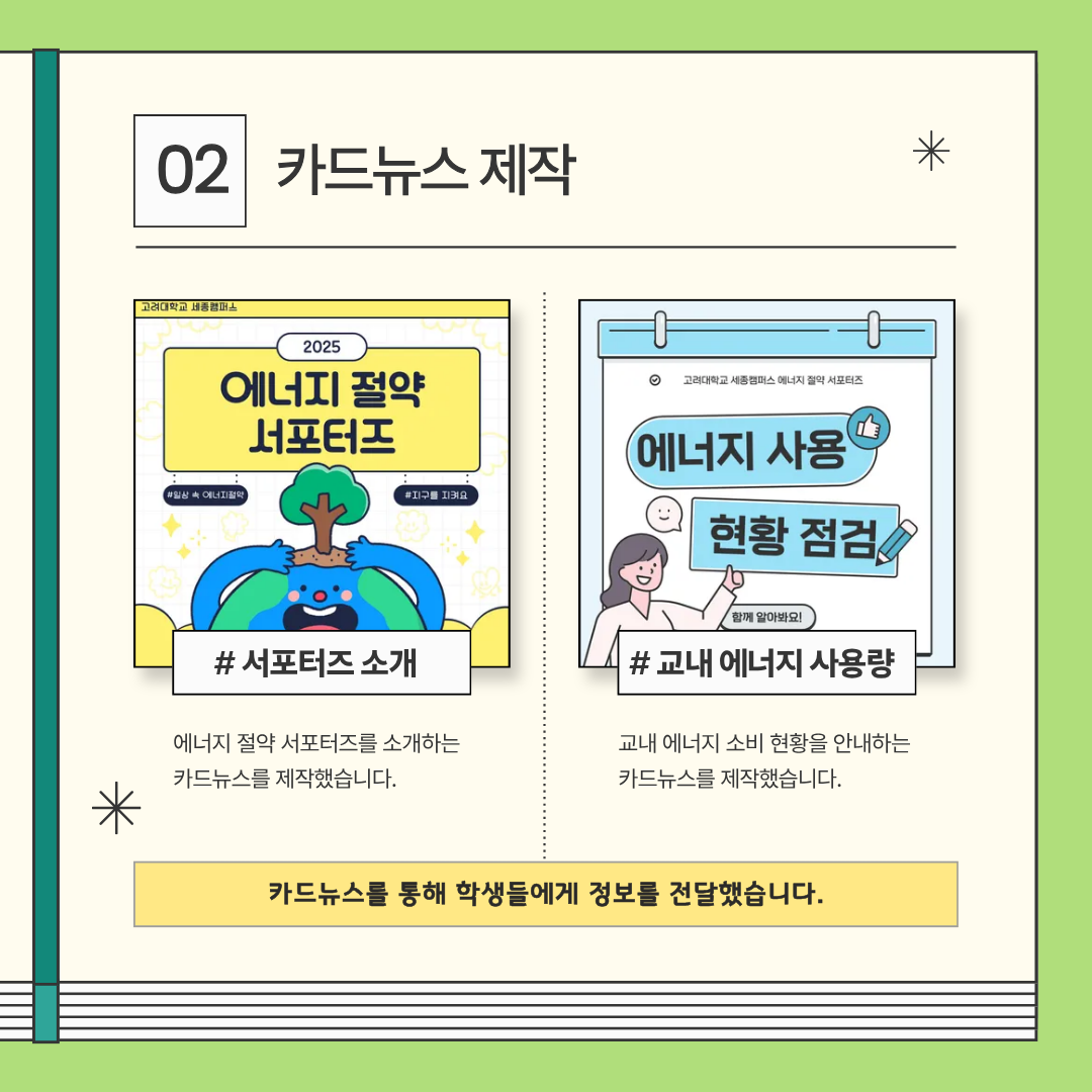 서포터즈 소개 카드뉴스와 교내 에너지 사용량 카드뉴스를 제작해 학생들에게 쉽게 정보를 전달했어요.