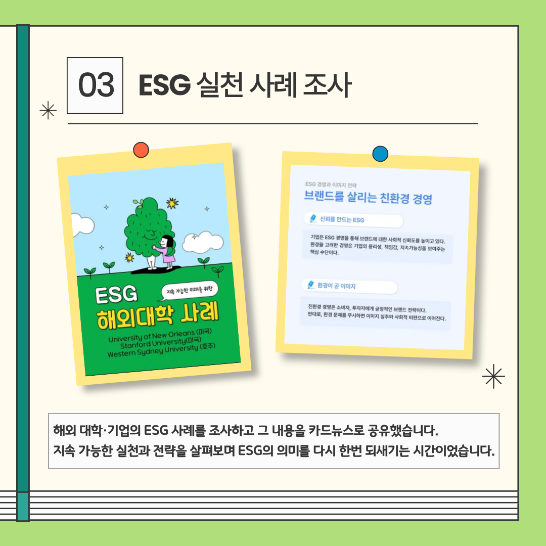 해외 대학·기업의 ESG 사례를 조사해 카드뉴스로 공유하며 지속가능한 실천의 의미를 되새겼어요.