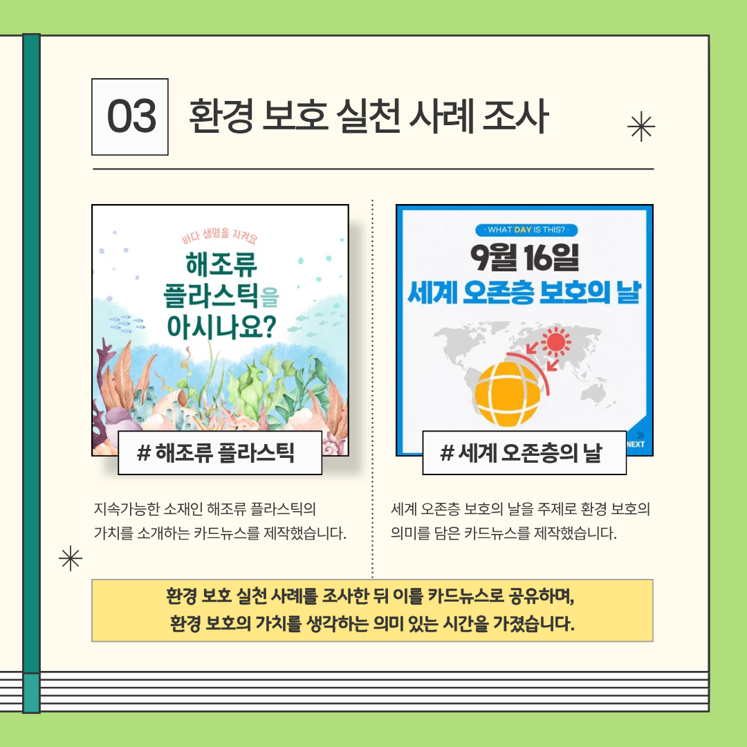 해조류 플라스틱, 세계 오존층 보호의 날 등 환경 보호 사례도 소개하며 함께 환경의 가치를 생각해보는 시간을 가졌어요.