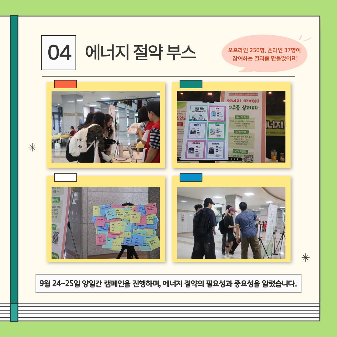 대면·비대면 회의를 통해 기획을 준비하고, 오프라인 캠페인에서는 에너지 절약 정보를 전하며 실천 다짐을 나눴어요.
